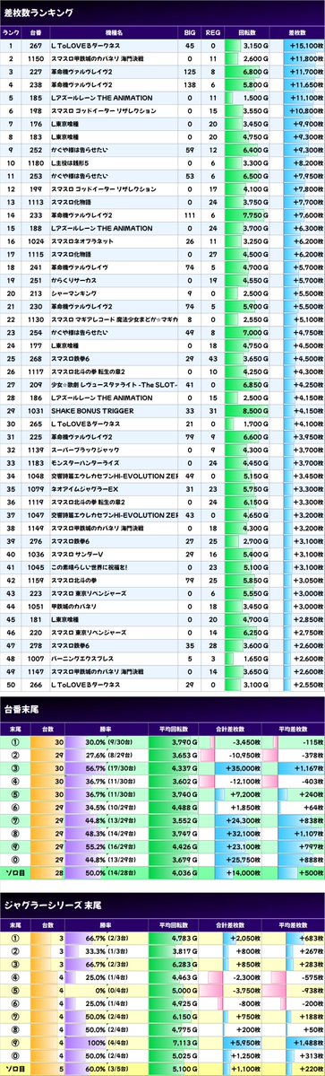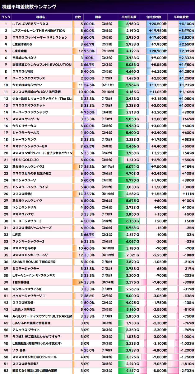 ✨平均差枚数上位機種✨