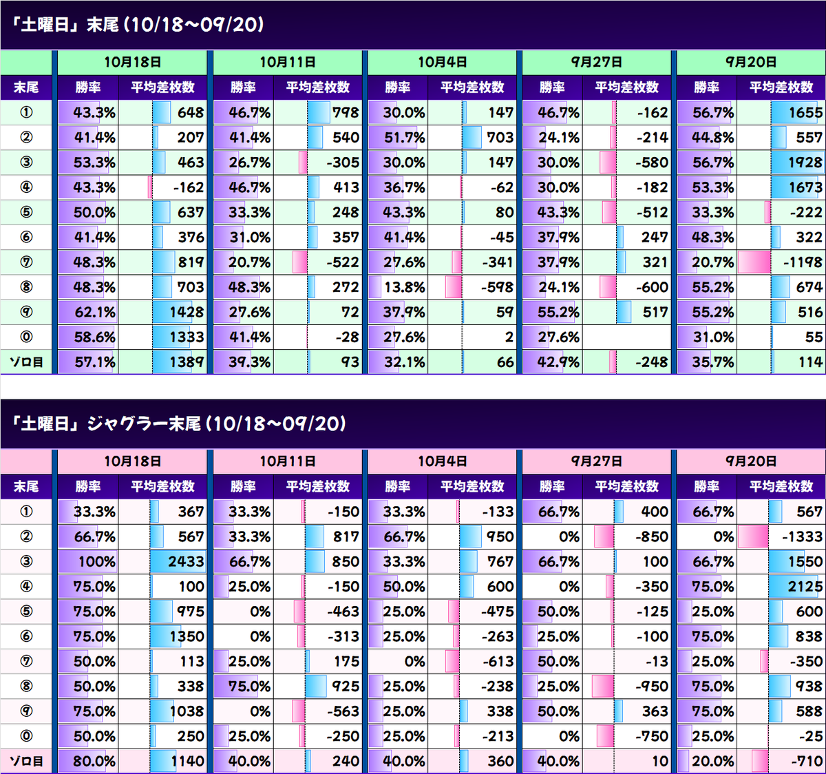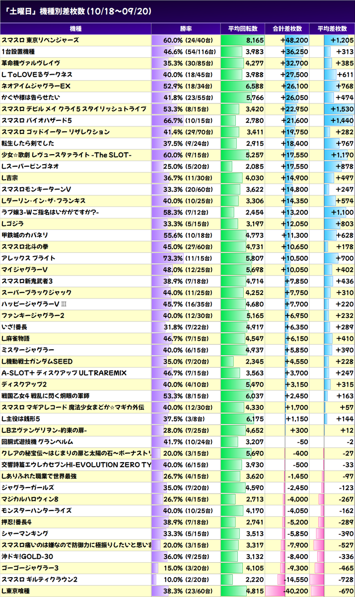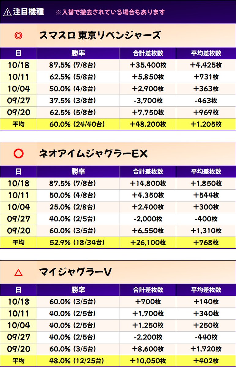 10/11 合計 +55,000枚 平均 +187枚(107/294台)