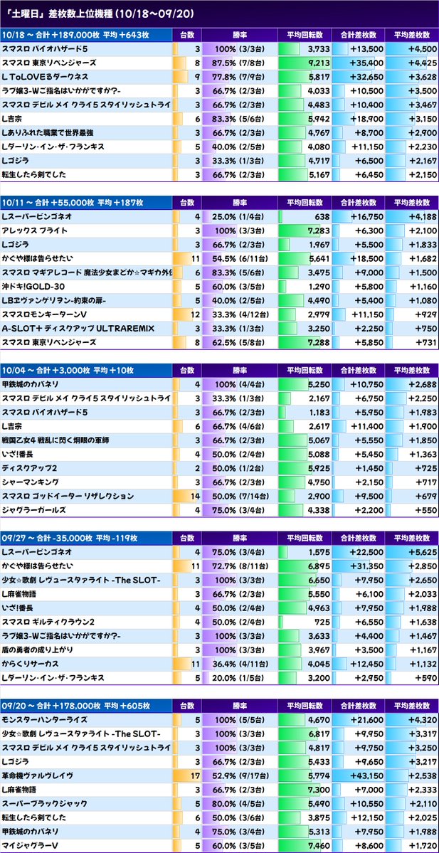 10/18 合計 +189,000枚 平均 +643枚(144/294台)