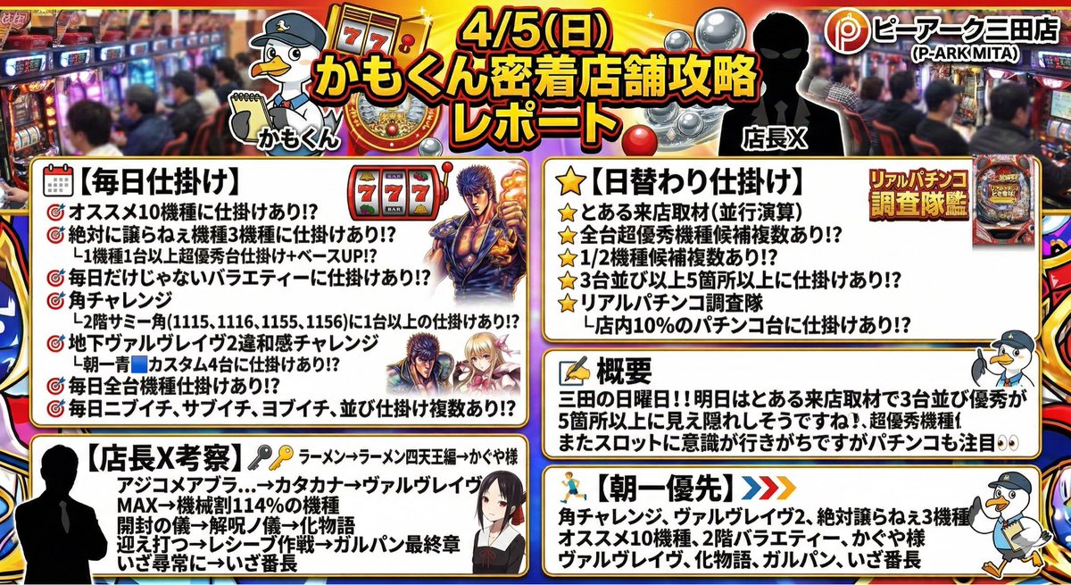 ➡️明日は週末に合わせて実績のあるとある取材開催と傾向的に"3台並び×5箇所"は確実となるので良挙動の周辺は狙い目になりますね📝 https://twitter.com/toaru_shuzai/status/2040278190015553684
