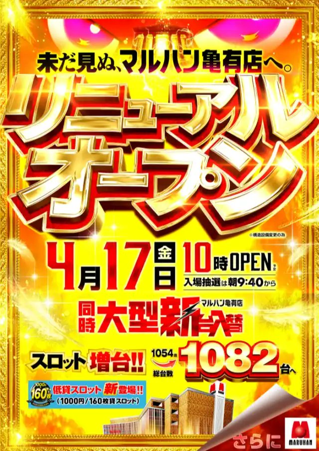 マルハン亀有【4月17日】リニューアル🎉 https://twitter.com/maruhan_kameari/status/2042075028083372135