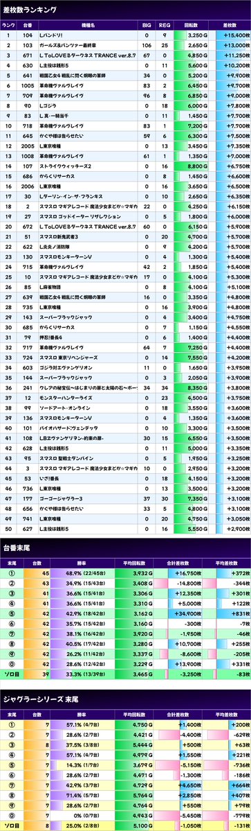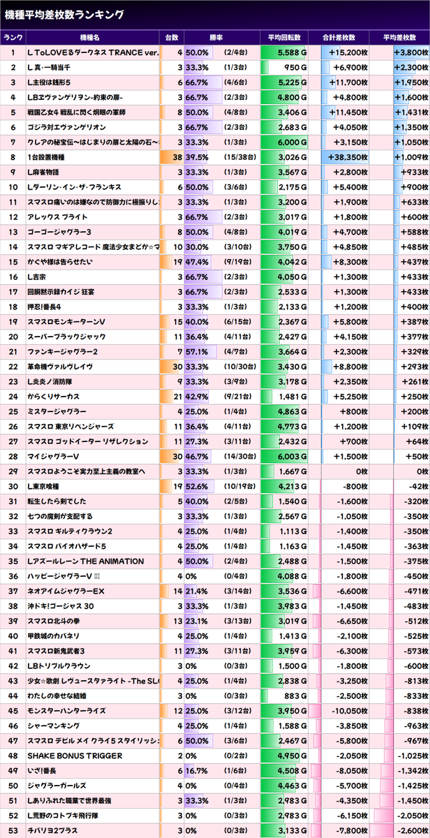 ✨平均差枚数上位機種✨