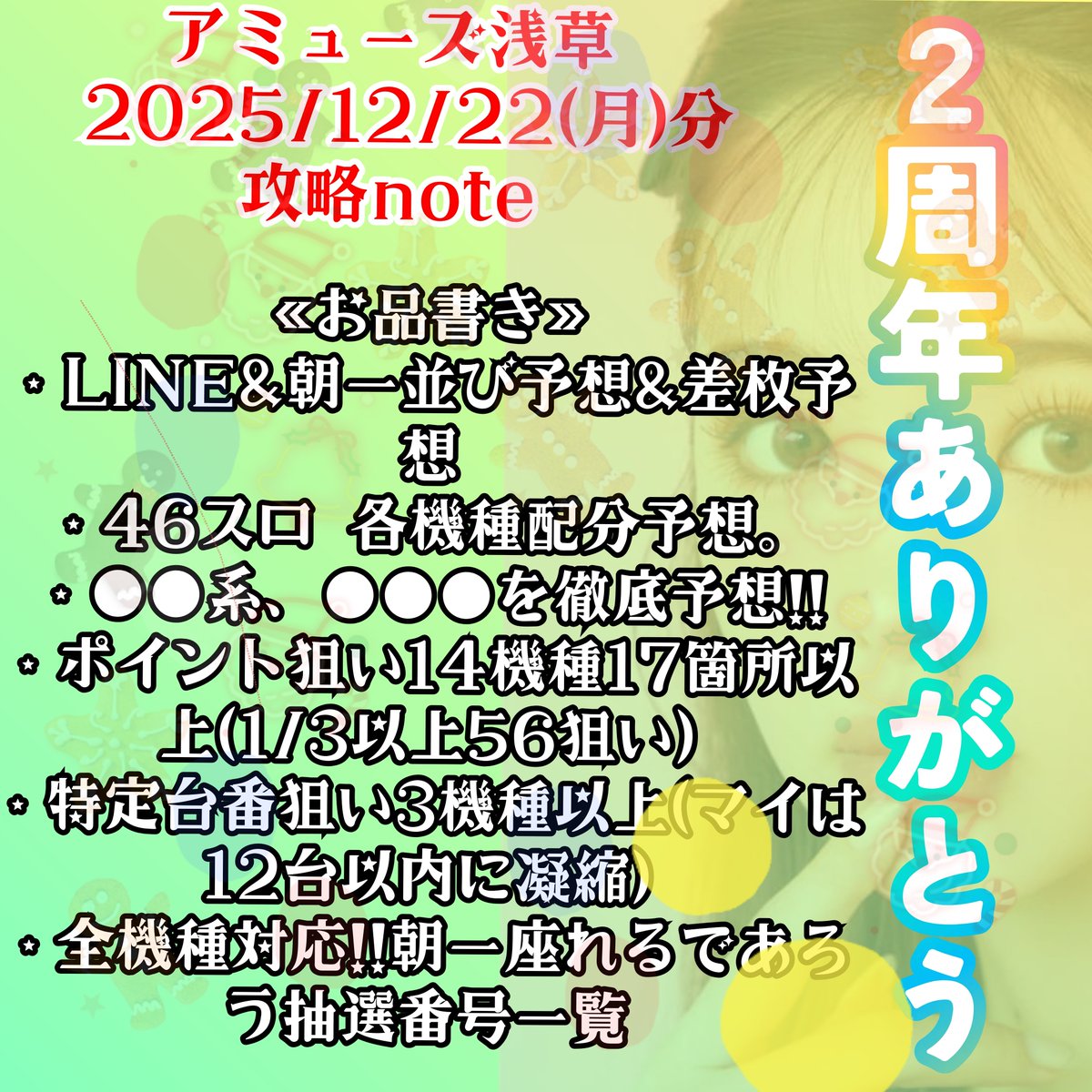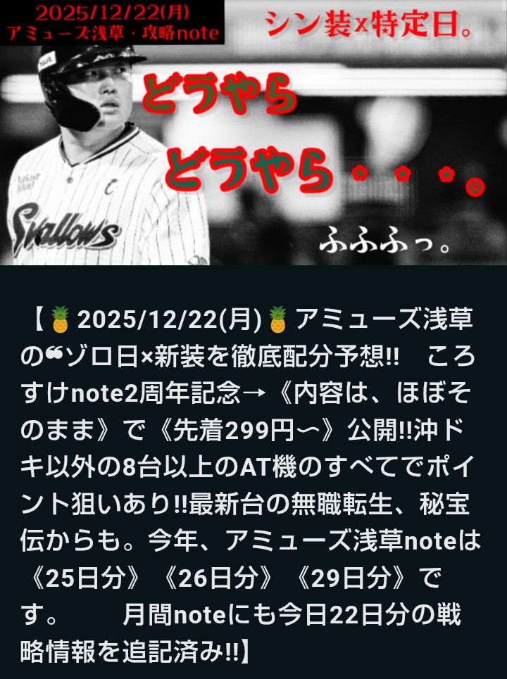 投稿本文: アイランド秋葉原】2025/12/22(月)高設定機種予想【パチスロデータ分析】|設定大好き!シゴロちゃん🎲 @ajyarakamokuba https://note.com/slot_456chan/n/n4b263778c18d?sub_rt=share_sb さらに表示
