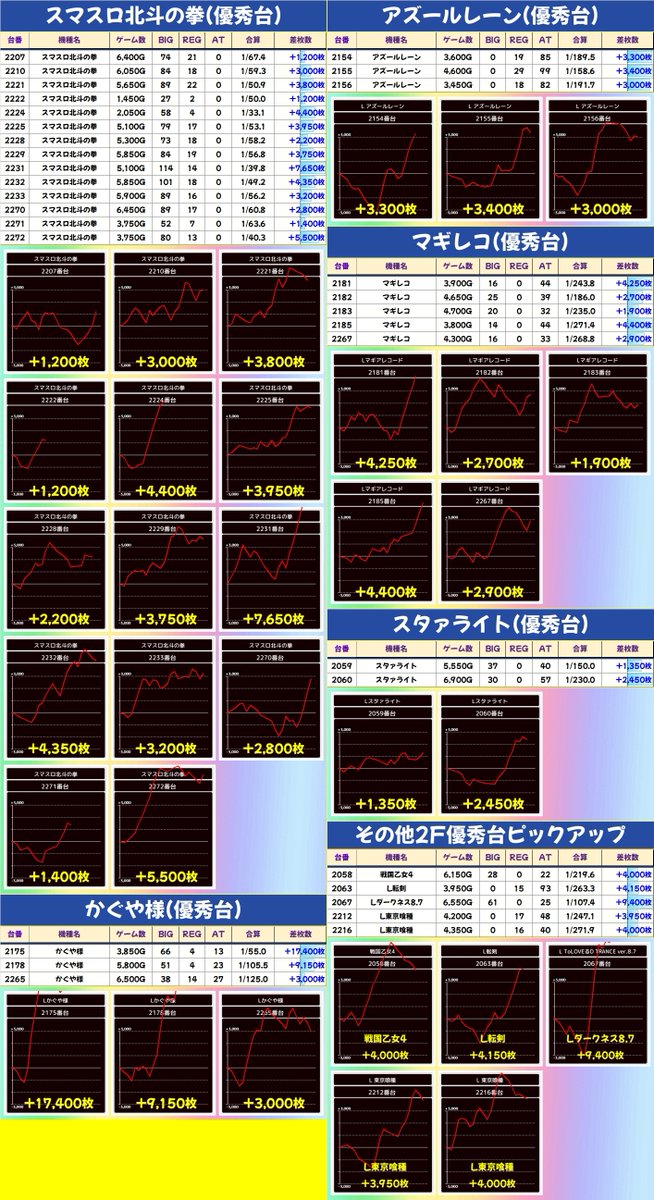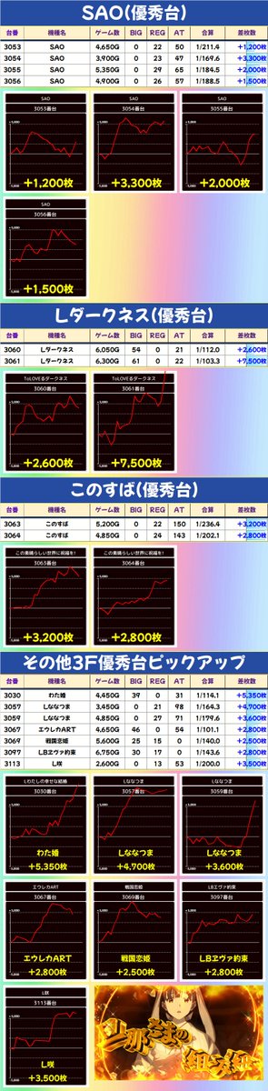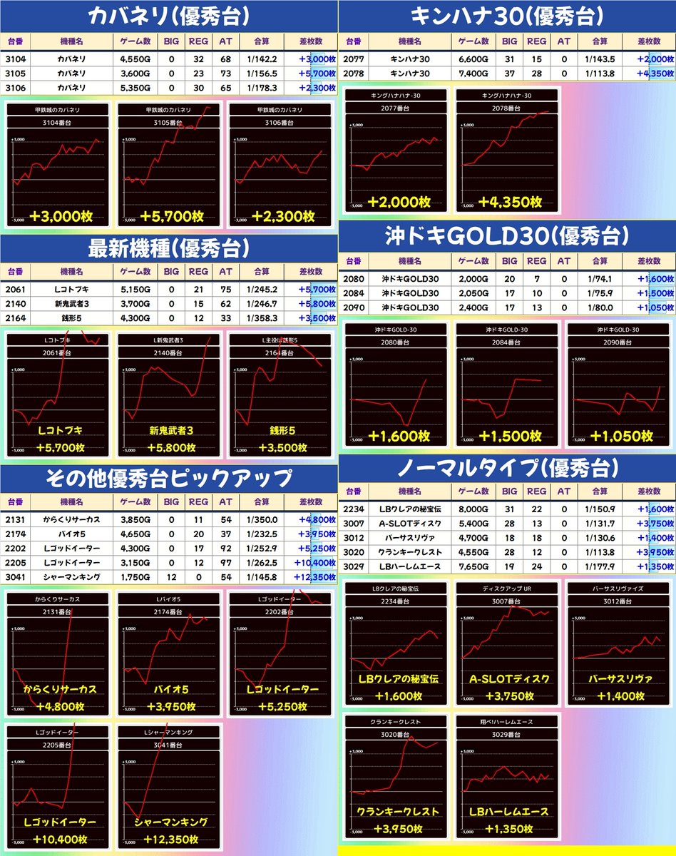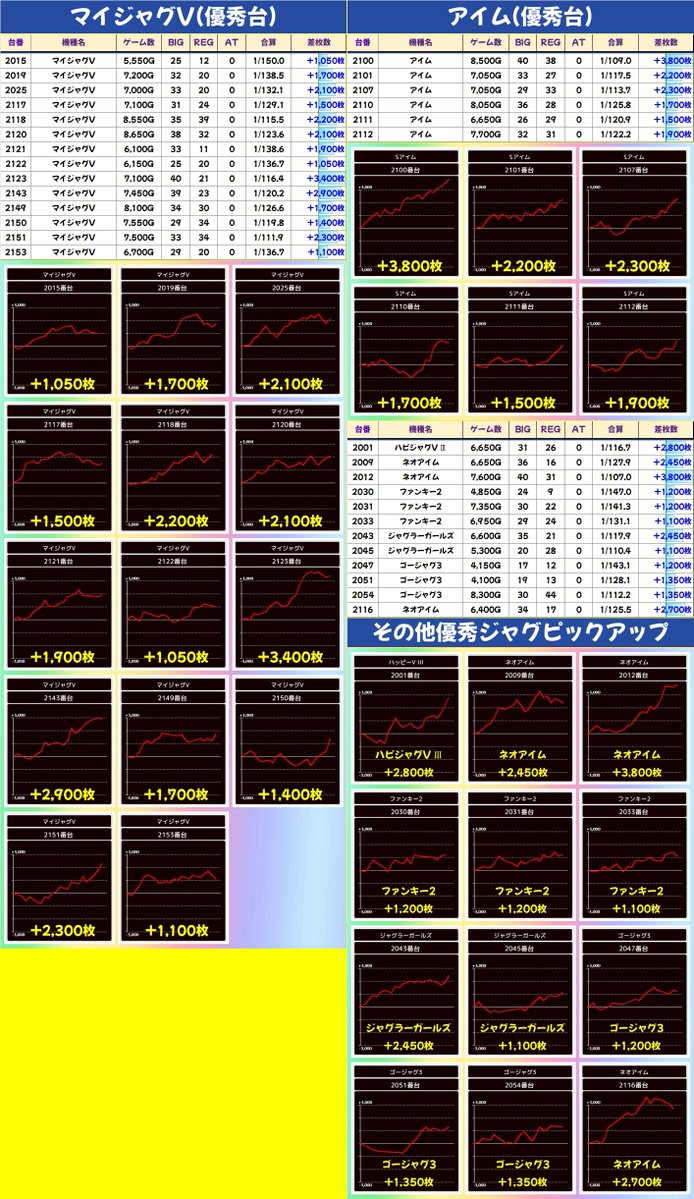 アイラちゃん家はほぼ順位変わってないです。平均差枚5,000枚以上の機種が多く、どこに行っても遊べる調整なのは本当にありがたいですね😋