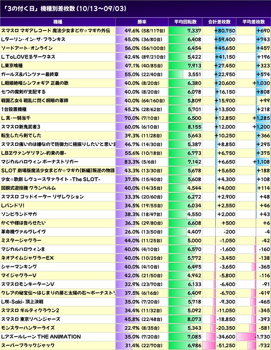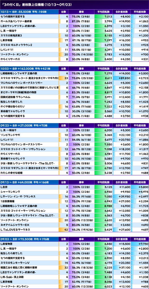 10/03 合計 +162,000枚 平均 +421枚(175/385台)