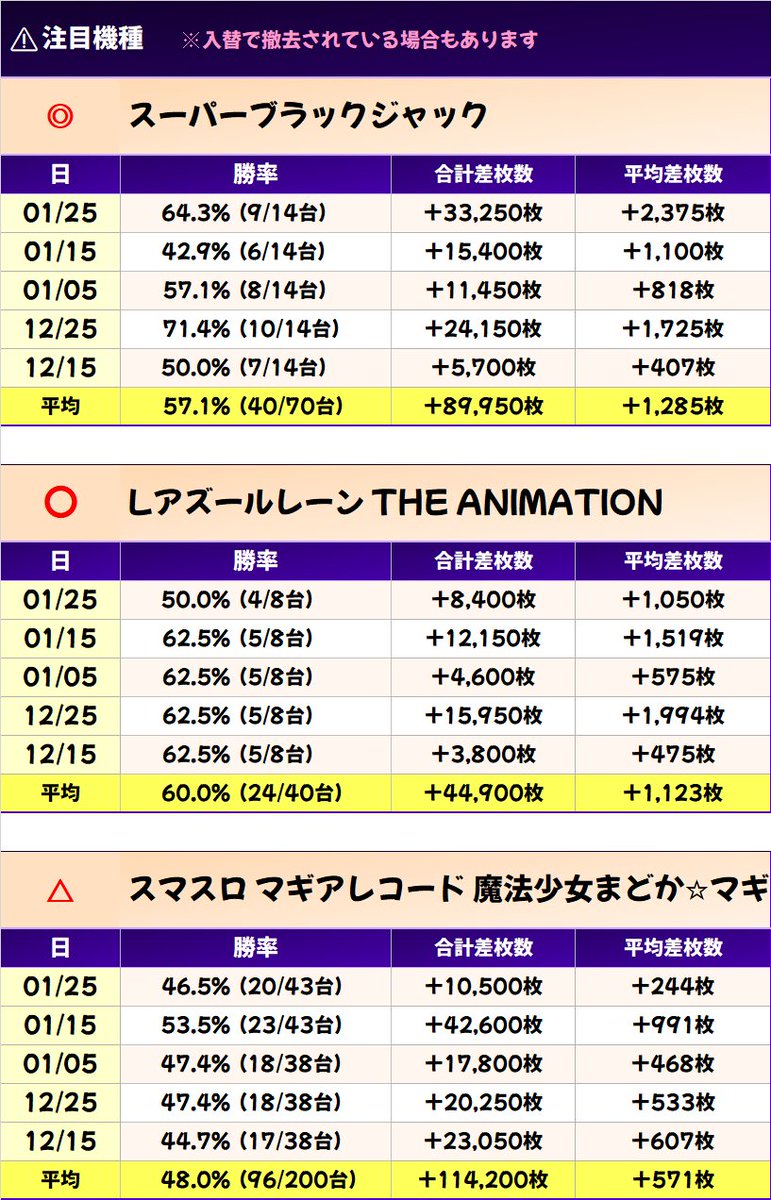 01/25 合計 +54,000枚 平均 +138枚(167/392台)