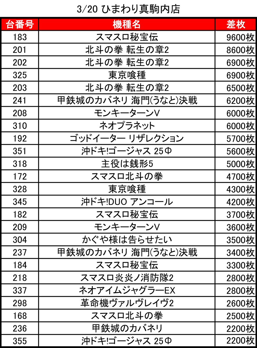 🗓️3/20 札幌出玉ランキング