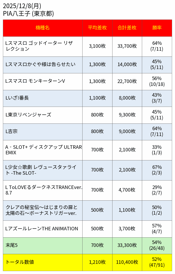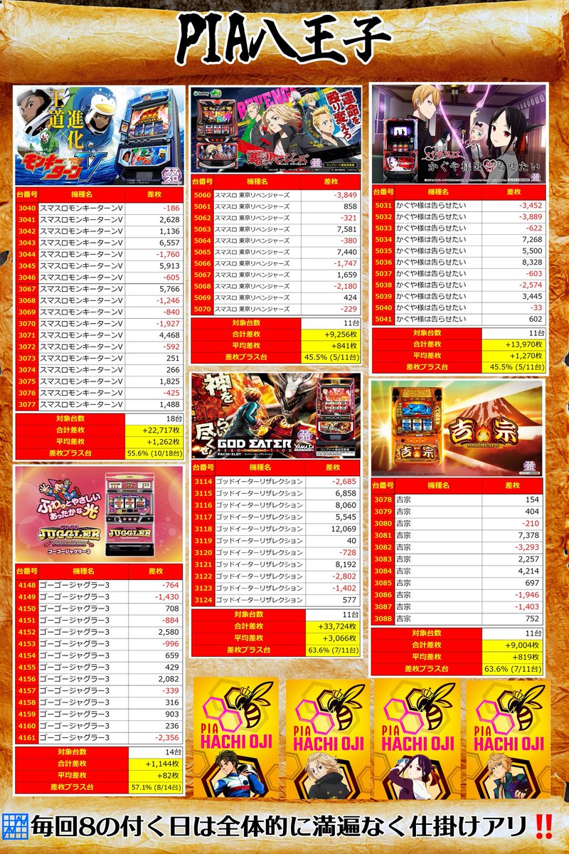 投稿本文: #スロット結果データ📈~東京都~12月8日(月)📖PIA八王子🐝8の付く日👑機種TOP3🥇ゴッドイーターリザレクション🥈かぐや様は告らせたい🥉モンキーターンV📝結果データの傾向全台系.1/2&1/3&1/4機種.並び.単品勝率:35.4%(169/478)抽選:107名📈万枚overは2台達成🎉 さらに表示