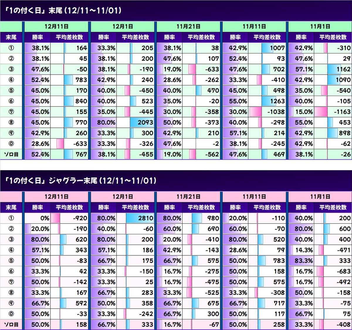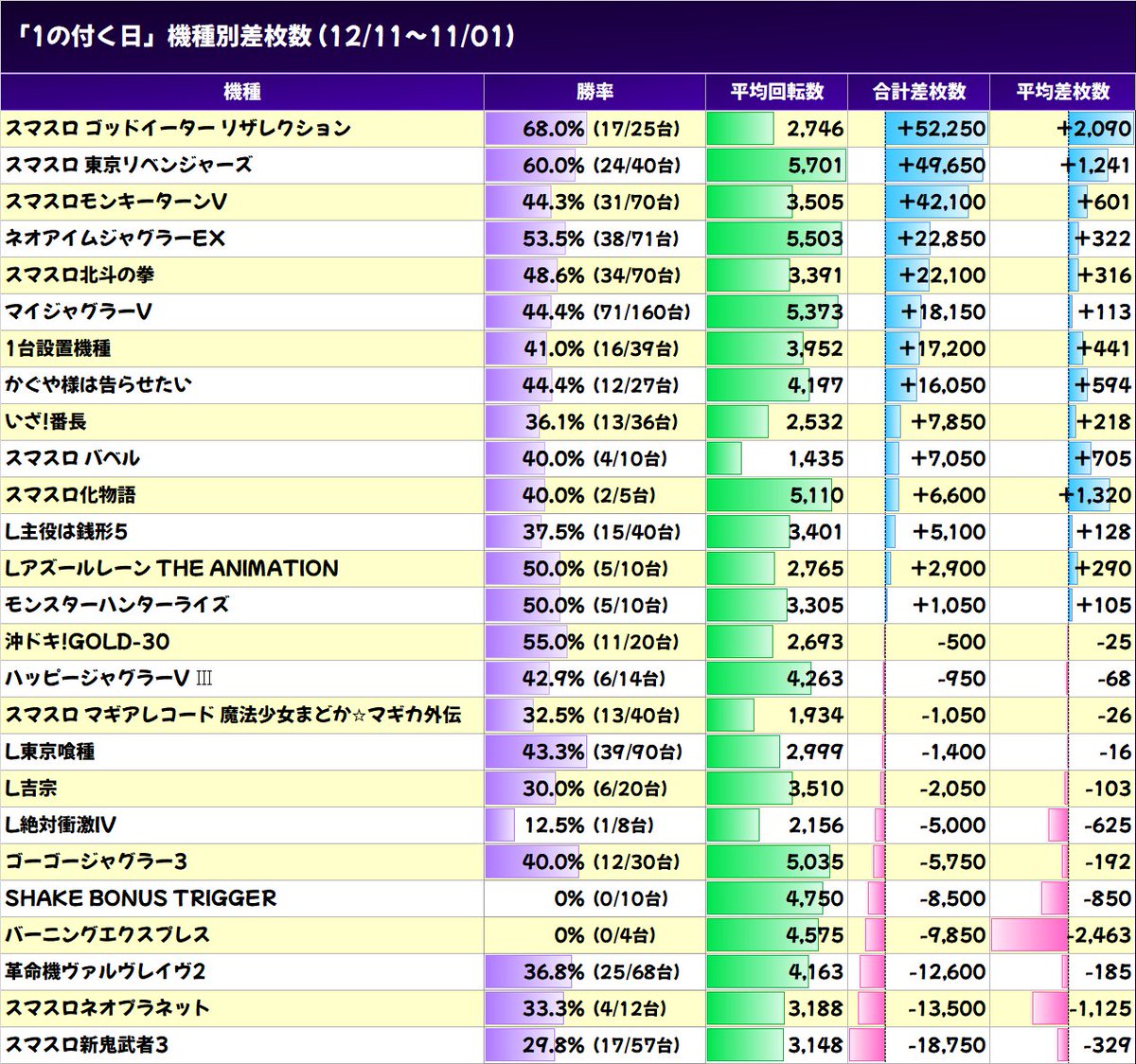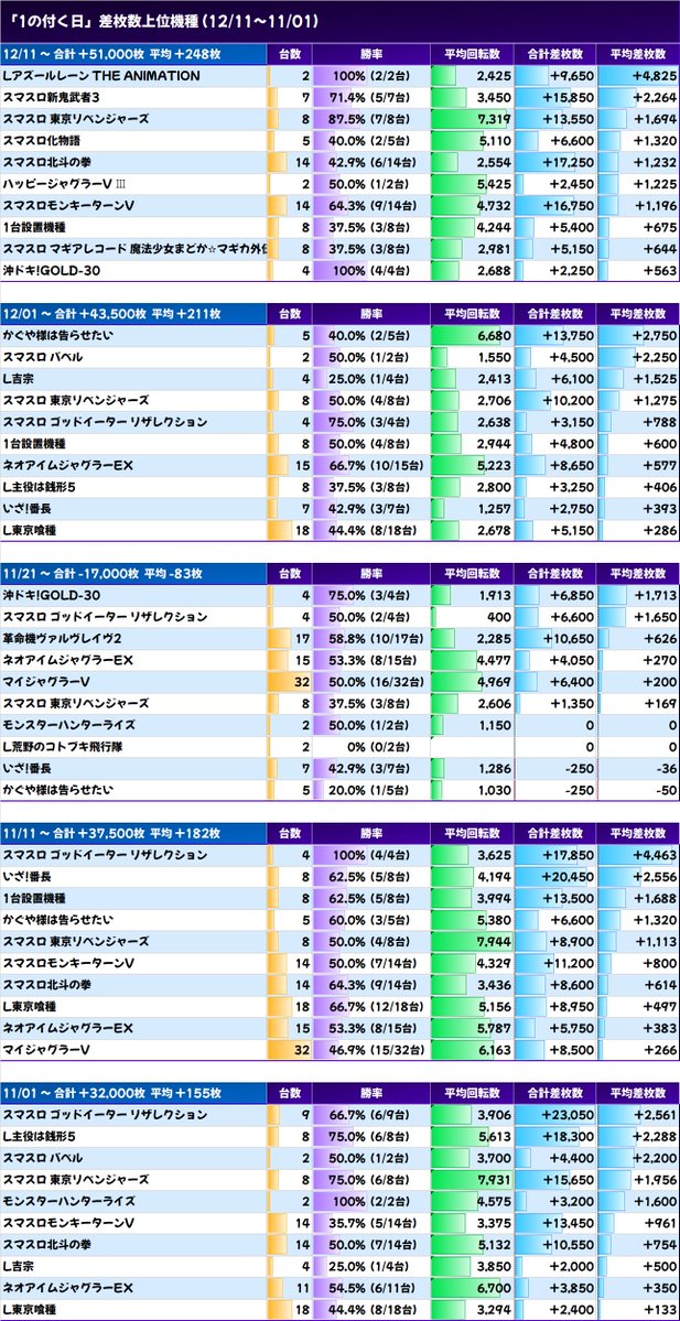 12/11 合計 +51,000枚 平均 +248枚(88/206台)
