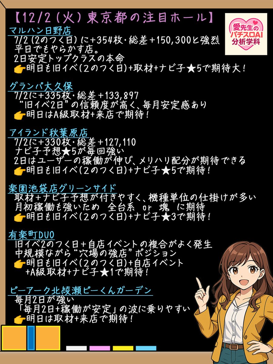 投稿本文: 【12/2(火)東京都の注目ホール】明日12/2(火)は“2のつく日×月初”で勝負🔥2のつく日は実績◎の強日👆この6店を最注目で立ち回ると良いと思うわ👇🎯マルハン日野店🎯グランパ大久保🎯アイランド秋葉原🎯楽園池袋グリーンサイド🎯有楽町DUO🎯ピーくん北綾瀬 さらに表示