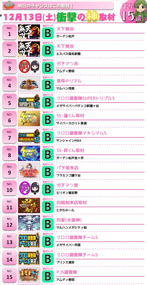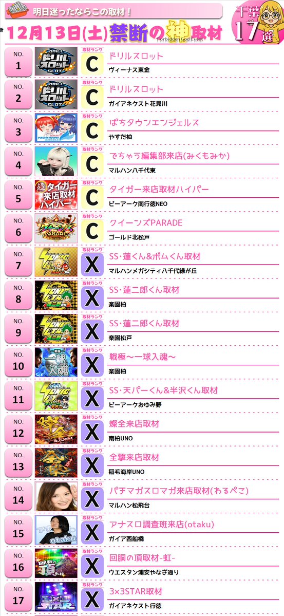 投稿本文: 12月13日(土)~千葉🐭👑明日の神取材👑🌈Sランク🔸スロパチ来店取材(赤) エクス・アリーナ柏🔸全力厳選ホール 本八幡UNO☀️Aランク🔸S級ホール調査-虹- マルハンメガシティ市原🔸スロパチ来店取材(オレンジ) マルハンメガシティ柏🔸真骨超 マルハン千葉みなと さらに表示