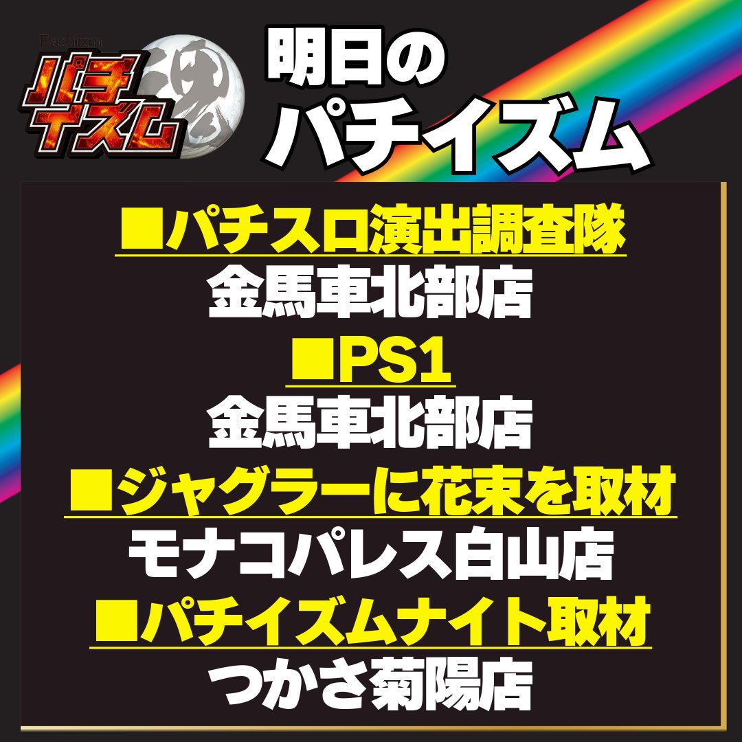 投稿本文: 【明日のパチイズム】2月6日(金)■パチスロ演出調査隊金馬車北部店■PS1金馬車北部店■ジャグラーに花束を取材モナコパレス白山店■パチイズムナイト取材つかさ菊陽店取材のご協力よろしくお願いいたします!!#PR #パチイズム #熊本 #パチンコ #パチスロ #パチスロ演出調査隊 さらに表示