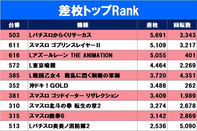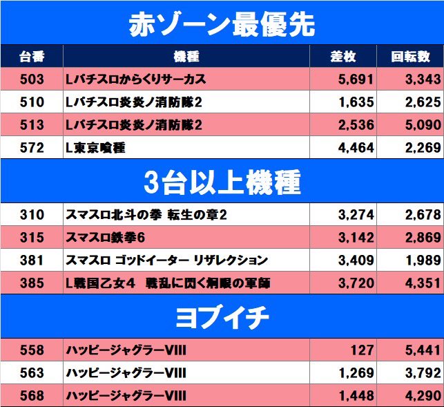 投稿本文: ◤◢◤ 結果まとめ ◢◤◢📅:2月10日(火)🏬:ピーアーク新田【取材内容】🫵零式来店取材🔍仕掛け✅🟥ゾーン最優先→4台✅3台以上機種→4台✅ヨブイチ→ハッピー✅差枚トップ𝕣𝕒𝕟𝕜𝕚𝕟𝕘→10台 さらに表示