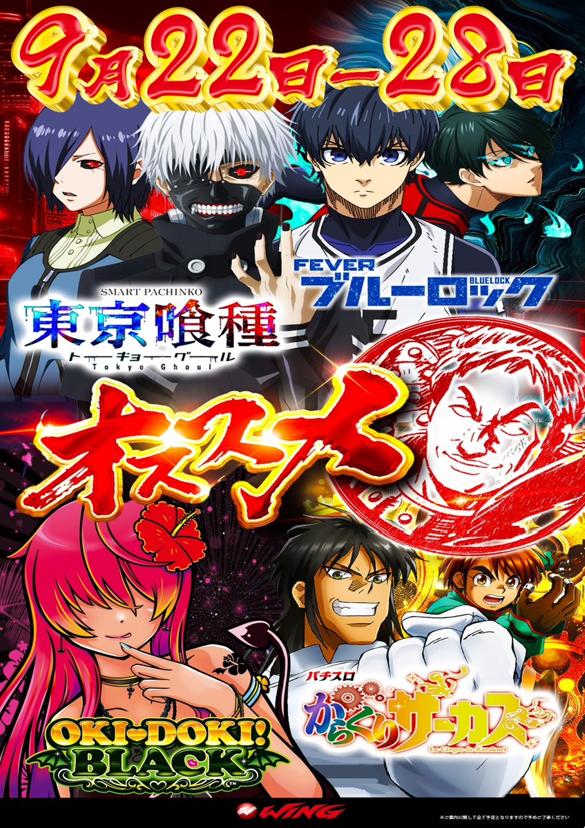 投稿本文: ウイング松阪南店です! 来週末のご案内💕 9月27日(土)・28日(日) 松阪南 玉城 【!!!主役を奪え!!!】 20スロ合計727台22日~28日のオススメも 要チェック✅パチンコ✅東京喰種✅ブルーロックスロット✅沖ドキBLACK✅からくりサーカス さらに表示