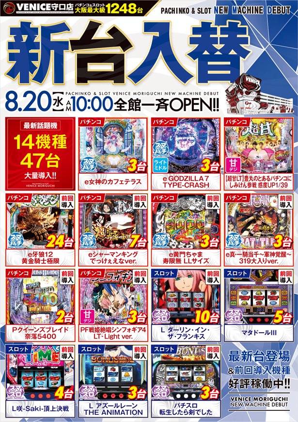 投稿本文: こんばんは🌙明日2⃣2⃣日AM1⃣0⃣:0⃣0⃣OPEN‼️e女神のカフェテラスeゴジラ7⃣豊丸のとあるパチンコにしみけん参戦など8⃣月度最新台から話題機まで1⃣4⃣機種4⃣7⃣台大量導入済🔥PS調査員来店予定😊@PACHITOWN_PS 明日も是非ベニス守口店へ😀#新台入替#PS調査員#想像以上 さらに表示