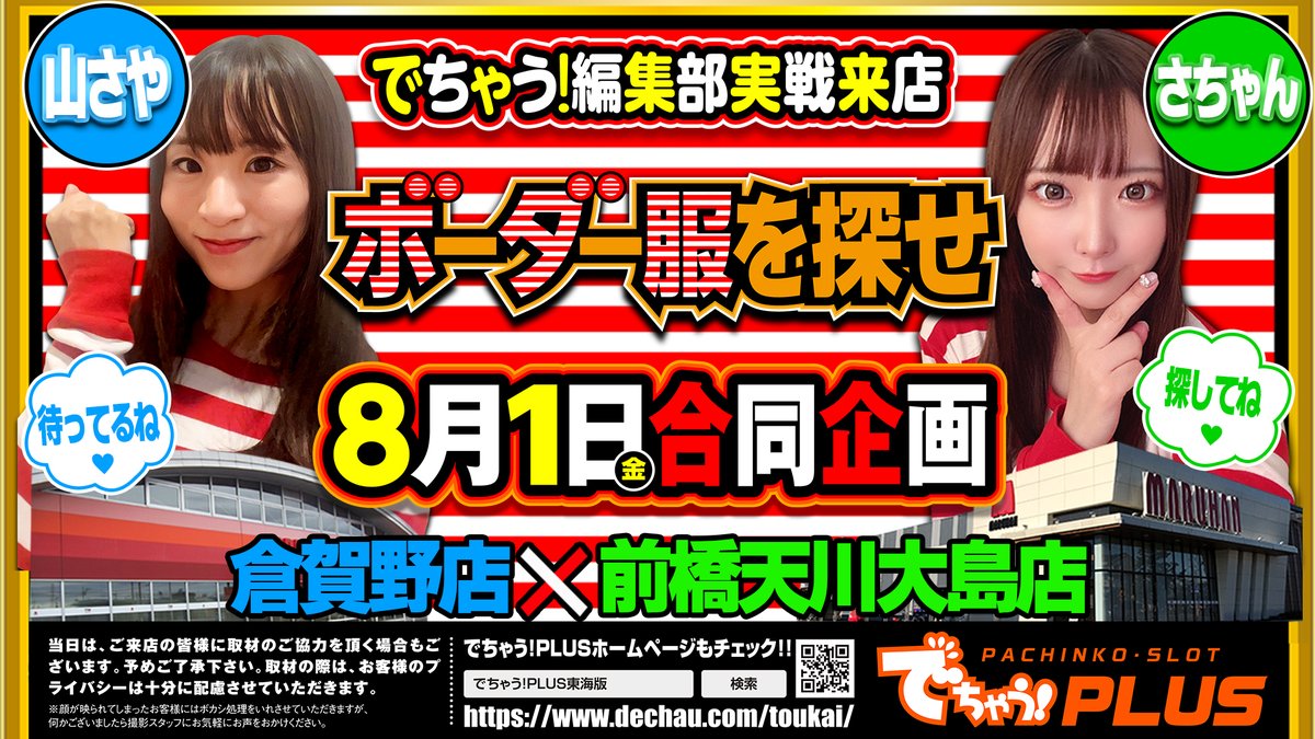 投稿本文: 📢緊急速報~📢なんと、8月1日にマルハン倉賀野店 ×マルハン前橋天川大島店前橋・高崎コラボ実施‼️でちゃう様主催「ボーダー服を探せ」2店舗同時来店✨倉賀野店には「山さやさん」前橋天川大島店には「さちゃんさん」が来店してくれます🎶開催まであと3日!待ち遠しい✨ さらに表示