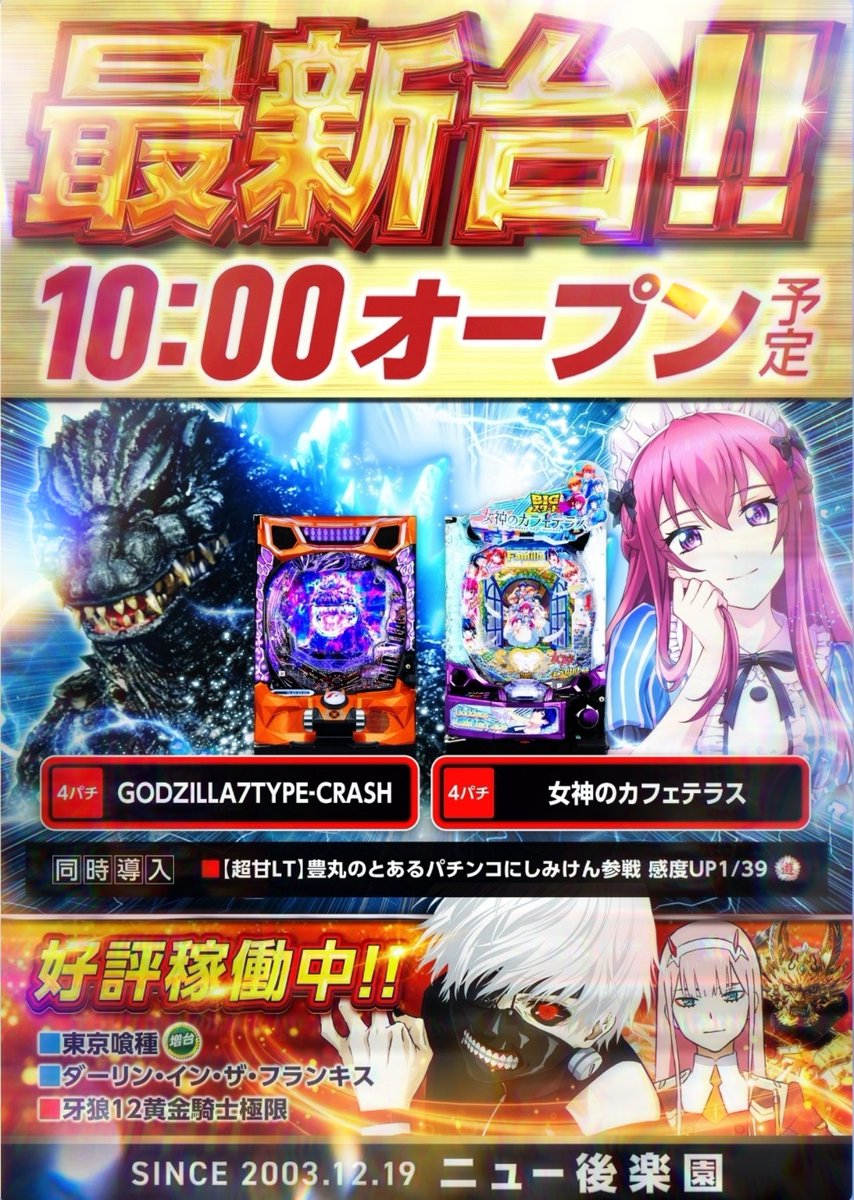 投稿本文: こんばんは🌛この後の時間も、楽しむなら #ニュー後楽園 へ‼️ご来店お待ちしております︎︎👍︎︎👍🌈ニュー後楽園市川店🌈✅市川北口おりて左へすぐ◀️◀️◀️👑パチンコ市川駅前最大👑🔸人気機種絶賛好評稼働中🔸#喰種 #炎炎 #東リベ #マギレコ #吉宗 #ジャグラー さらに表示