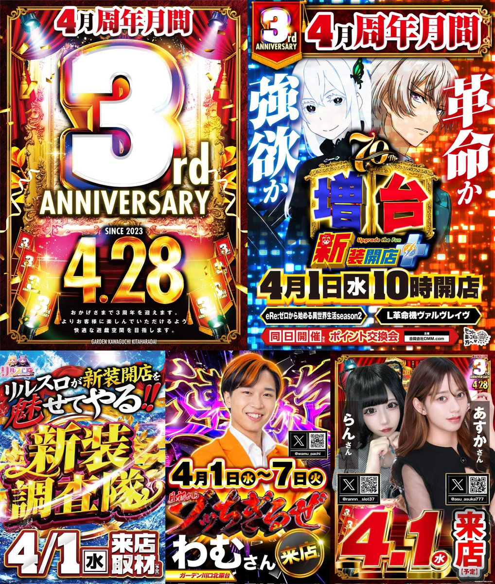 投稿本文: 📢4月1日(水)🏠️ガーデン川口北原台🎊4月周年月間開幕🎊グループ創業70周年💡PS新装開店➕━━━━━━━━📝抽選 9:40🎉全館10時開店━━━━━━━━🎉4月周年月間開幕🎉✅リルスロトリプル来店┗らん┗あすか┗わむ(4/1~4/7連旋中‼️)┗新装開店調査隊🔎取材 さらに表示