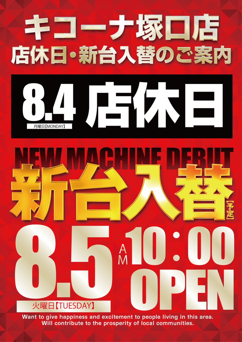 投稿本文: キコーナ塚口店です!!明日8月4日は新台入替準備のため、店休日となります#新台入替 #つぶやキコーナ さらに表示