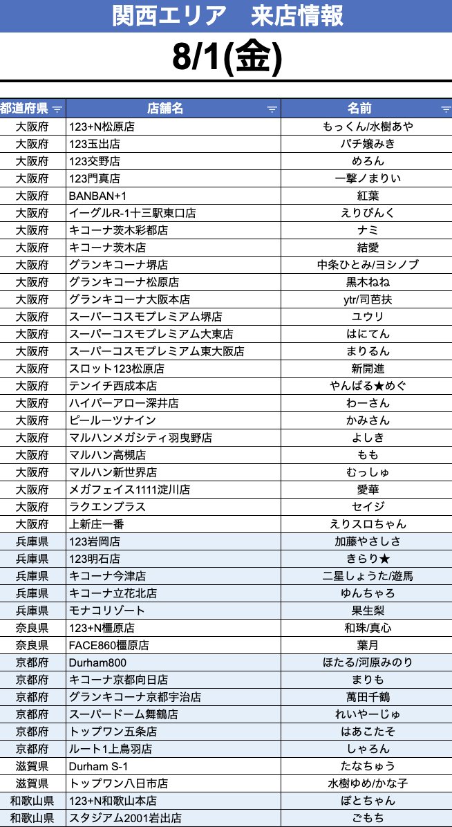 投稿本文: 🌀8/1(金) 来店情報🌀.【大阪府】・123+N松原店 👉 もっくん/水樹あや・123玉出店 👉 パチ嬢みき・123交野店 👉 めろん・123門真店 👉 一撃ノまりい・BANBAN+1 👉 紅葉・イーグルR-1十三駅東口店 👉 えりぴんく・キコーナ茨木彩都店 👉 ナミ・キコーナ茨木店 👉 結愛・グランキコーナ堺店 さらに表示