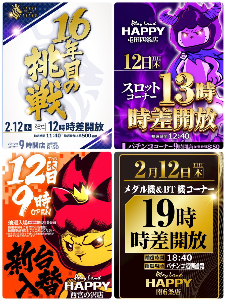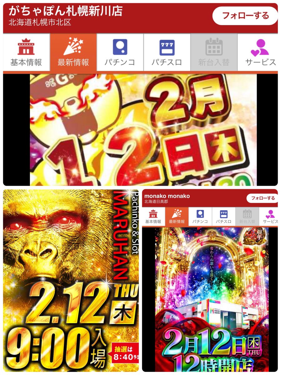 投稿本文: 🗓明日2/12のお店💁♀️延長営業終了🙌☞ドラゴン来店&タイガー来店取材ベガスベガス狸小路⏰9時☞16年目の挑戦ハッピー麻生⏰スロ12時☞金ひなひまわり新琴似⏰12時☞👿ハッピー屯田4条⏰13時☞特日2のつく日がちゃぽん新川monako monakoマルハン滝川☞にゃんまる景品案内 さらに表示