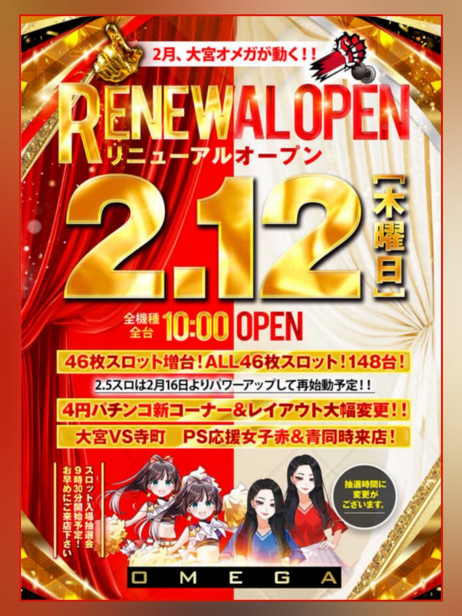 投稿本文: 2026/02/12(木)は何処へ【12日】🧂オメガ白梅町(サメちゃん)【2のつく日】⛵️ぱちんこ村(宮内あい)⛵️BIGディパー大久保【Et cetera】🚀オメガ寺町(応援女子🔴🔵)🚀大宮オメガ(応援女子🔴🔵)⛵️オメガ千代原口(応援女子🔴)🧂ベニス京都八幡(スロパチ取材🟣) さらに表示