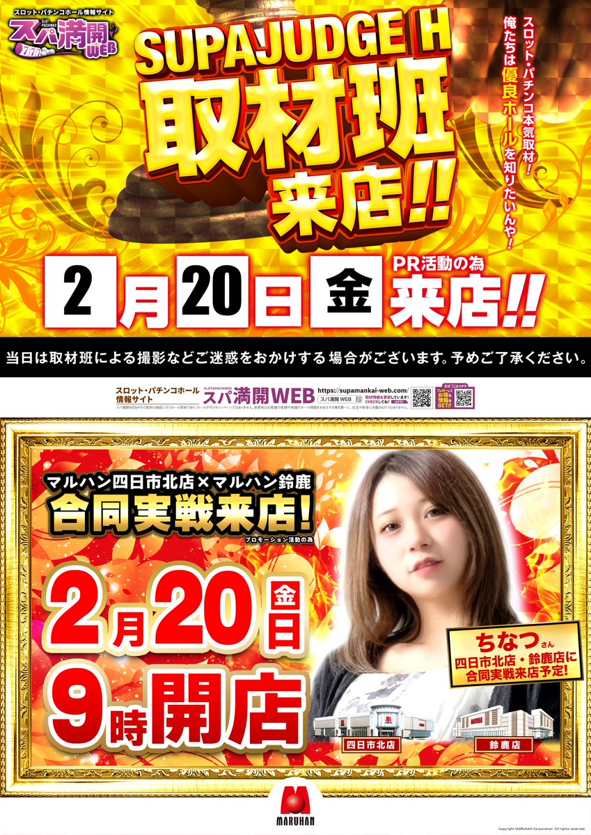 投稿本文: ▼▽やるね♪明日20日(金)は❗▽▼・✧・✧・✧・✧・✧・✧・✧・✅スパジャッジH取材班マルハン鈴鹿店×四日市北店✅実戦来店➡️ちなつさん ⏩@okuchina0910 ・✧・✧・✧・✧・✧・✧・✧・🕘入場抽選は朝8時45分予定🕘ご来店お待ちしております♪ さらに表示