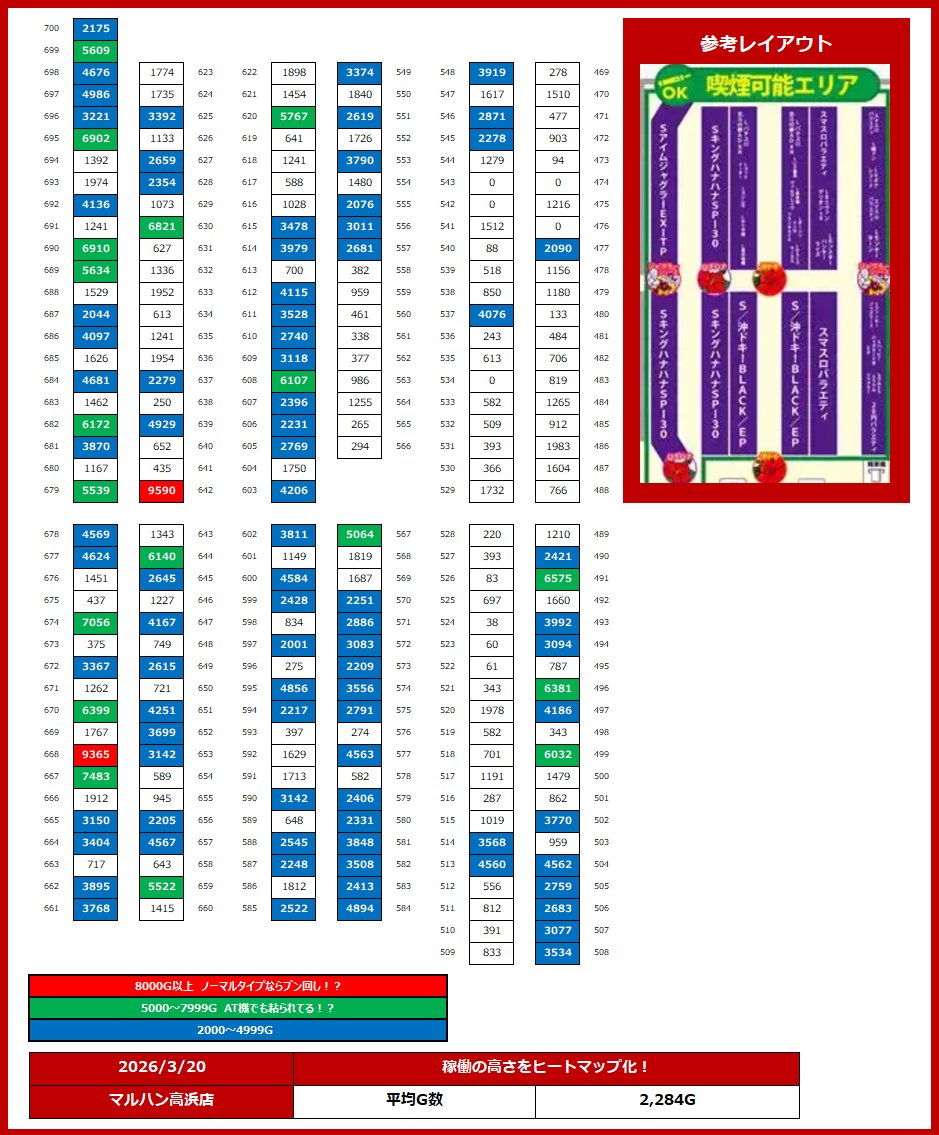 投稿本文: 3月20日 マルハン高浜店📝クロロマスクH結果■独自結果まとめ✅稼働の高さをヒートマップ化✅差枚でのMAPは現在試行中✅出来次第順次切り替え予定✍️傾向を読み解き次回へ繋ごう👍※詳細は島図画像 さらに表示