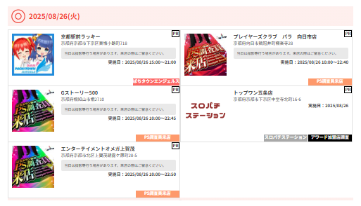投稿本文: 8/26【関西】ビリケンさん予想⚡⭐京都🎯エンターテイメントオメガ上賀茂🎯Gストーリー500→PS調査員来店(虹)🎯プレイヤーズクラブ パラ向日市店→PS調査員来店(赤)🎯スーパードーム西院店→龍馬ジュン 来店🎯キコーナ京都向日店→ZENTZ・mico・伍代咲 来店 さらに表示