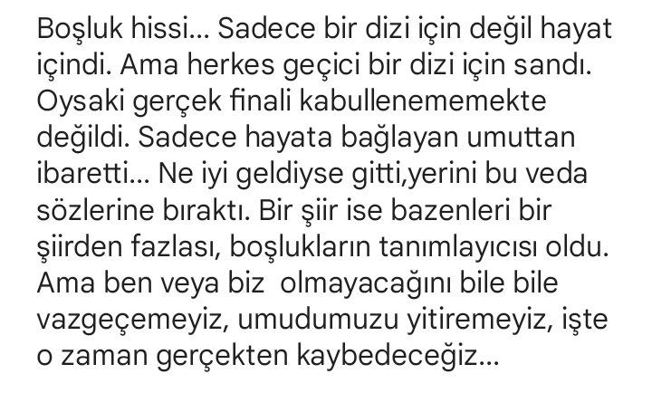 "Final olmasın" isteği ne kadar güzel bir istek ama bir o kadar yetersiz değil mi? Bu şiir gibi hissettiriyor aynı...