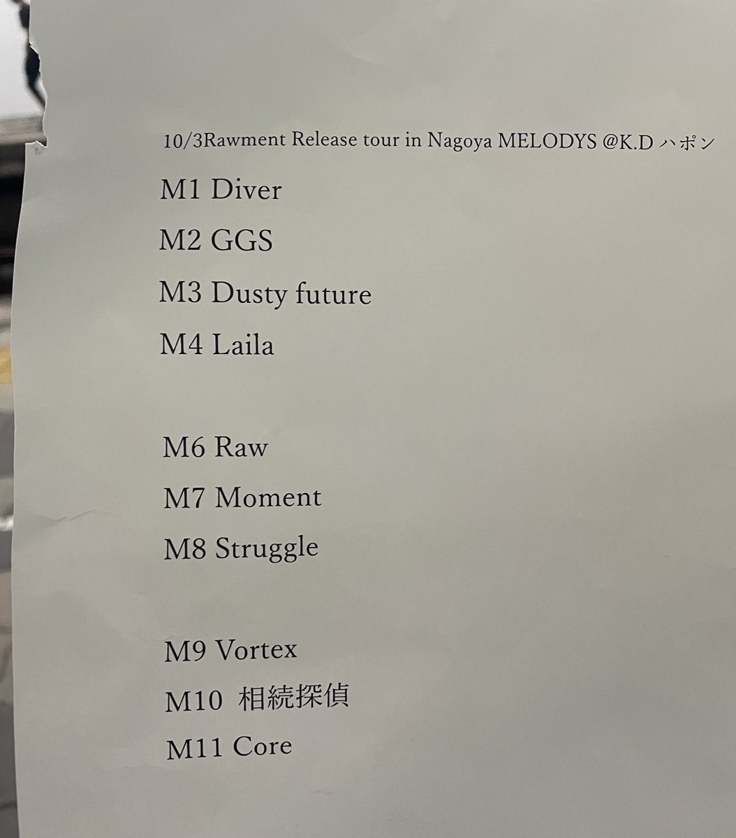 投稿本文: 本日のセトリと、本日の推し🫶10/3Rawment Release tour in Nagoya MELODYS KDハポンM1 DiverM2 GGSM3 Dusty futureM4 LailaM6 RawM7 MomentM8 StruggleM9 VortexM10 相続探偵M11 CoreアンコールHeartJourney#ローメント さらに表示