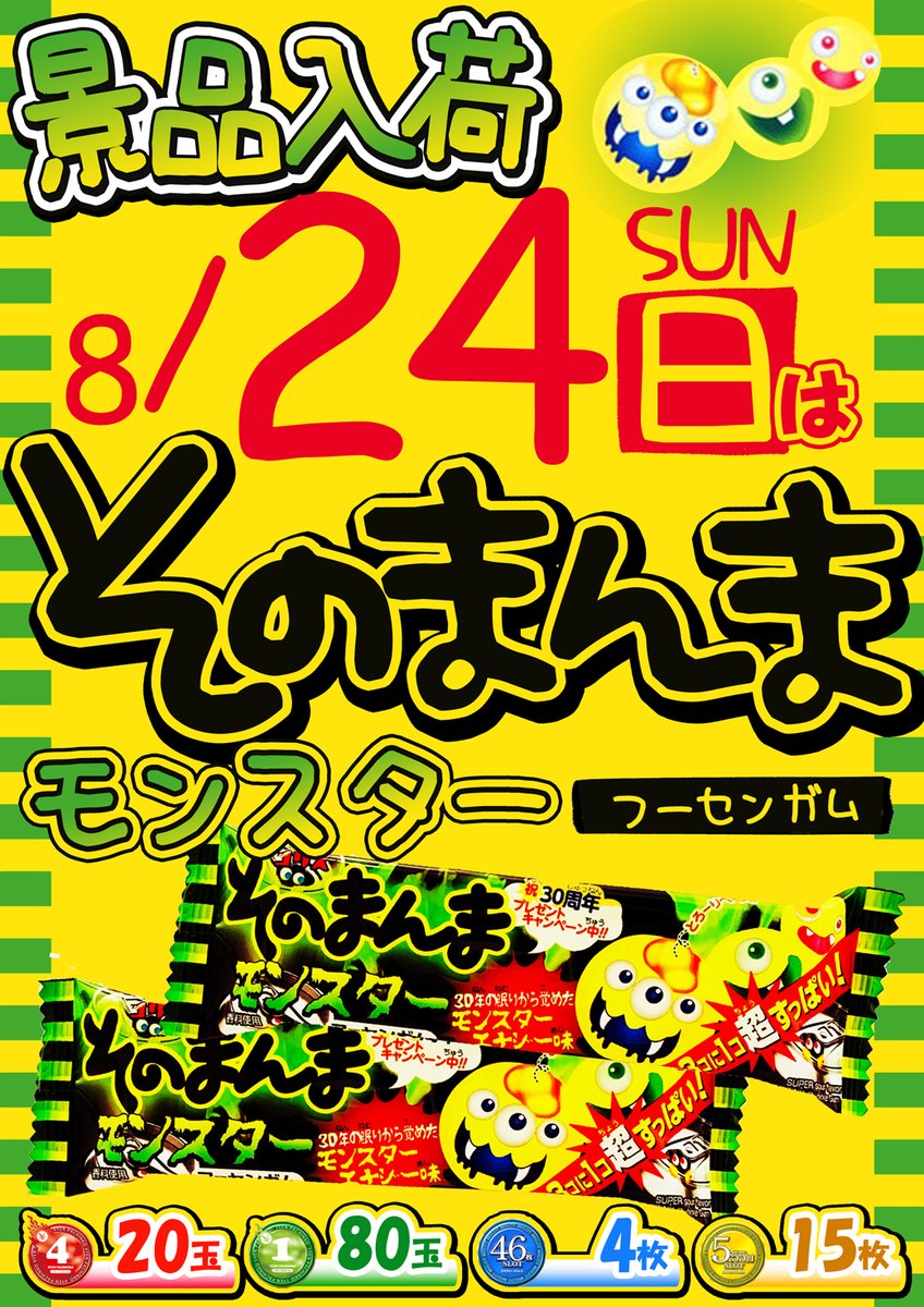 投稿本文: こんばんわ熊店長です🐻明日8月24日(日)は…景品入荷で~す🎁『そのまんまモンスターフーセンガム』3コに1コが超すっぱい!!そして明日はファン感最終日!!まだまだ豪華賞品ありますよ🎁週末は是非ダイエー日立店へ💨#ダイエー日立店 #ファン感謝デー#そのまんまフーセンガム さらに表示