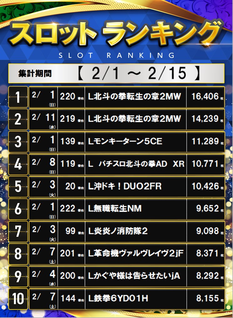 投稿本文: こんばんは! ダイナム山口宇部港町店です!👑2月前半PS出玉ランキング👑期間:2/1(日)~2/15(日) 2月前半の出玉ランキングとなります😀 是非ご覧ください! この後の時間も多数様のご来店お待ちしております😄 #ダイナム #港町 #ランキング さらに表示