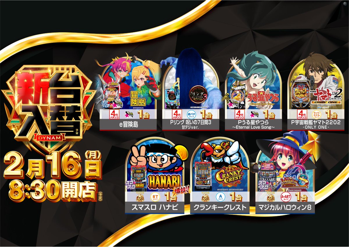 投稿本文: ダイナム気仙沼店よりご案内です♪ 2月16日(月)新台入替(予定)💫😄8:30開店予定となってます😄 新台につきましては準備が出来次第開放予定です😁店内販促も見逃し厳禁ですよ😎 朝からのご来店をお待ちしております⭐ さらに表示
