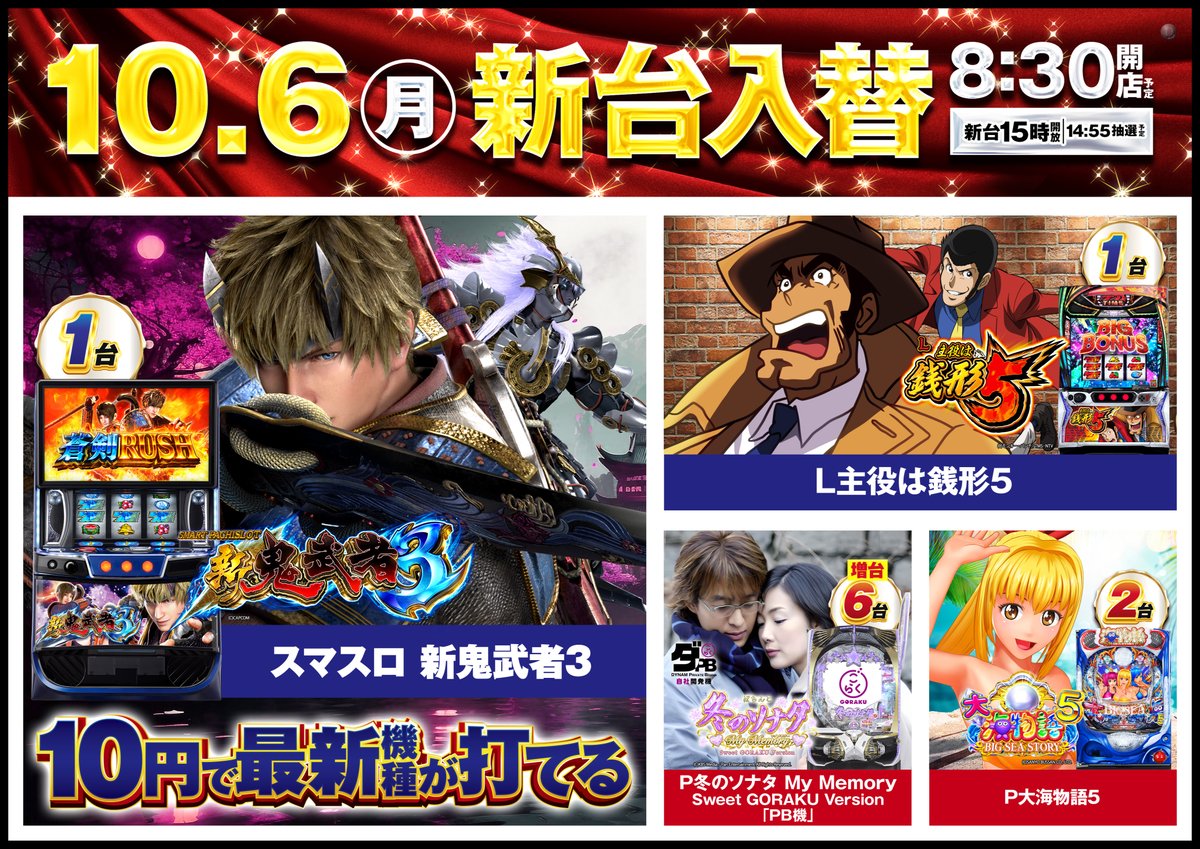 投稿本文: こんばんわ。ダイナム古川店です😎明日10月6日(月)は新台入替8:30OPEN(予定)新台開放は15:00を予定致しております。ご遊技ご希望のお客様は 14:55までに景品カウンター横にお集まり下さいませ😆#ダイナム #大崎市 #古川 さらに表示
