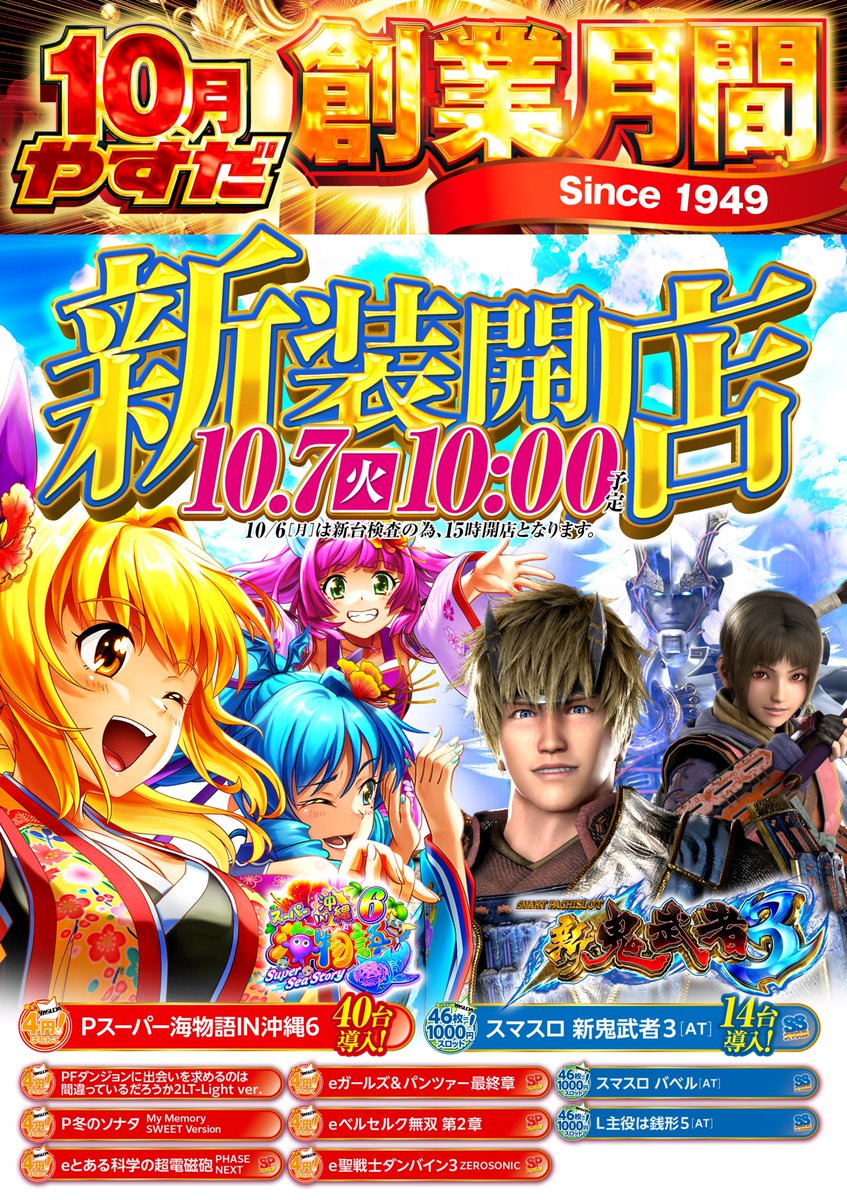 投稿本文: やすだ朝霞店 10月7日(火)新装開店10時OPEN 最新台!P沖海6地域最大級40台!加熱式タバコ可エリアに設置 最新台!新鬼武者3 14台他一挙10機種101台導入!! https://30227.p-world.jp さらに表示