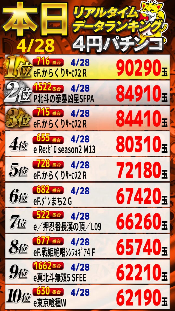 投稿本文: こんばんは('◇')ゞメガフェイス1500宗像店です!!昨日は多くのお客様のご来店誠にありがとうございました🫡👑出玉ランキングの情報です👑スロットと4円パチンコは惜しくもコンプリート出来ませんでしたが1位~10位まで万枚万発続出でした👏👏 さらに表示