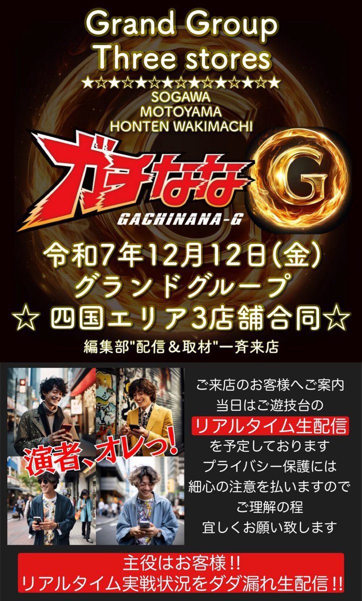 投稿本文: 🗓️12月12日(金)【G-ONE SLOT十川店】━━━━━━━━━━━━━━━✅特定日🌈∟ 周年月間🎉∟ グランドグループ創業月間(60周年)㊗️∟3店舗合同❗️配信取材📸(ガチなな-G-)【パーラーグランド本店脇町店】【パーラーグランド元山店】【G-ONE SLOT十川店】━━━━━━━━━━━━━━━ さらに表示