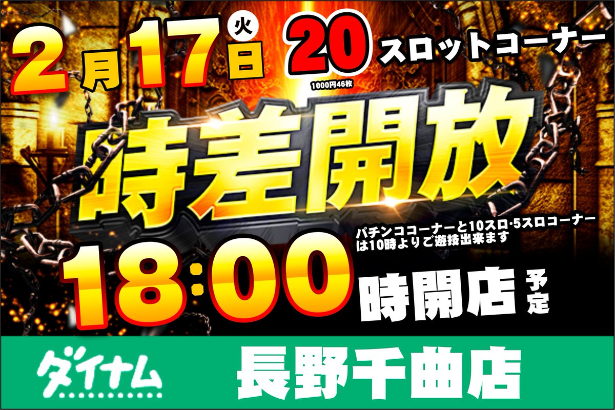 投稿本文: ダイナム千曲店|#ちくダの店長『8:05』の不定期ポスト2/17(火) 本日は毎回大好評 『スロットコーナー 18時 時差開放』今回の対象は20スロコーナーです抽選は《17:40》より正面入口前にて行います多数様のご参加 お待ちしております#ダイナム さらに表示