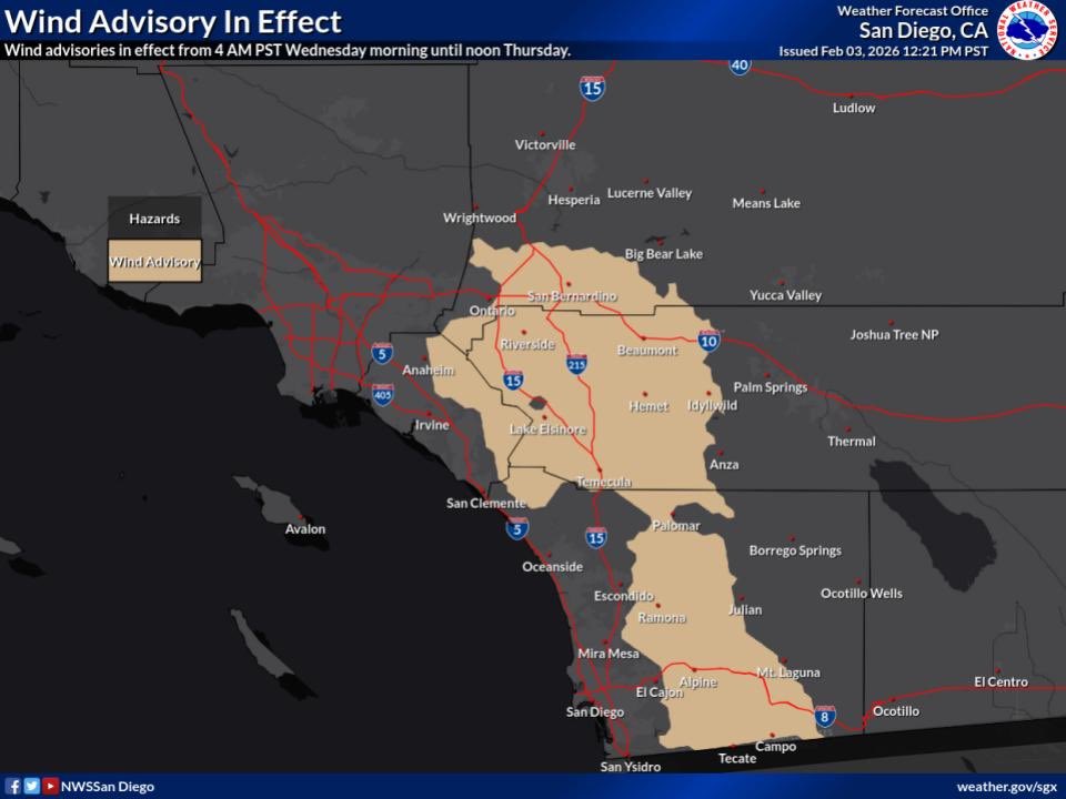 Skies will be partly sunny as clouds from the south move across our area. Gusty offshore, Santa Ana winds will also