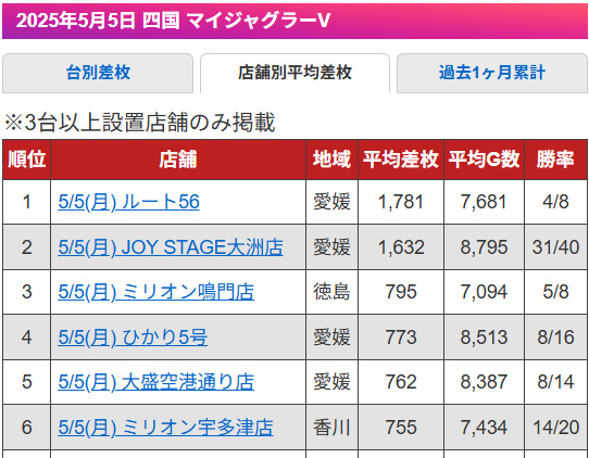 6位以降https://min-repo.com/ranking-kishu/?ym=&date=2025-05-05&kishu=%E3%83%9E%E3%82%A4%E3%82%B8%E3%83%A3%E3%82%B0%E3%83%A9%E3%83%BCV&chihou=%E5%9B%9B%E5%9B%BD&type=heikin