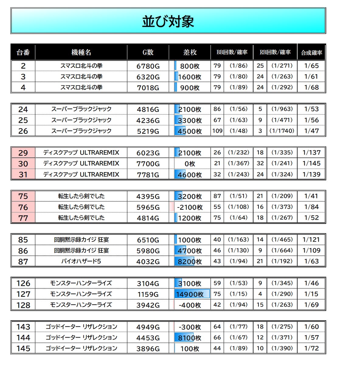 並びの対象はおすすめ機種のジャグ・ハナ系が中心となるので狙いやすい。
