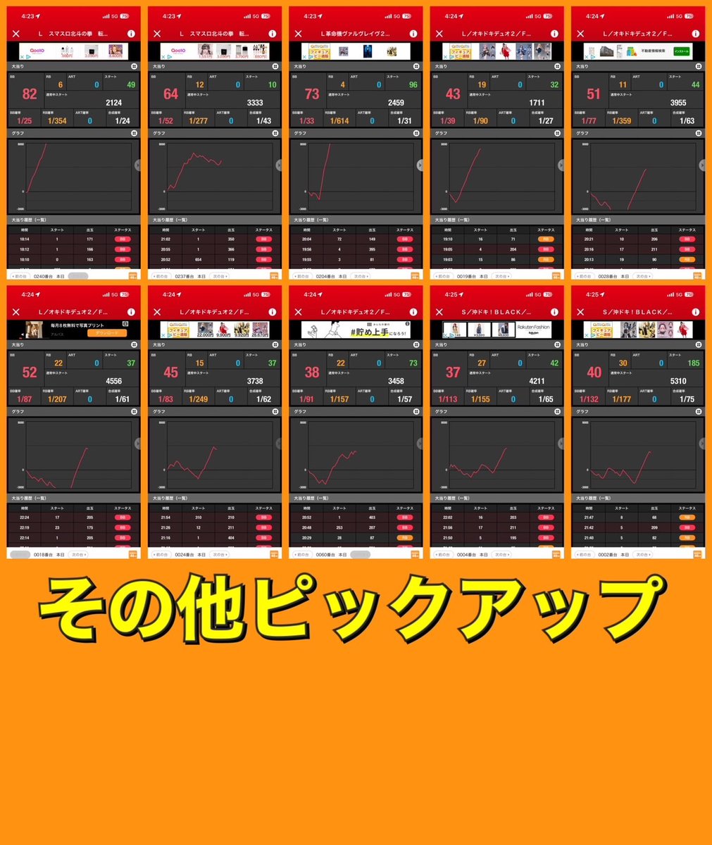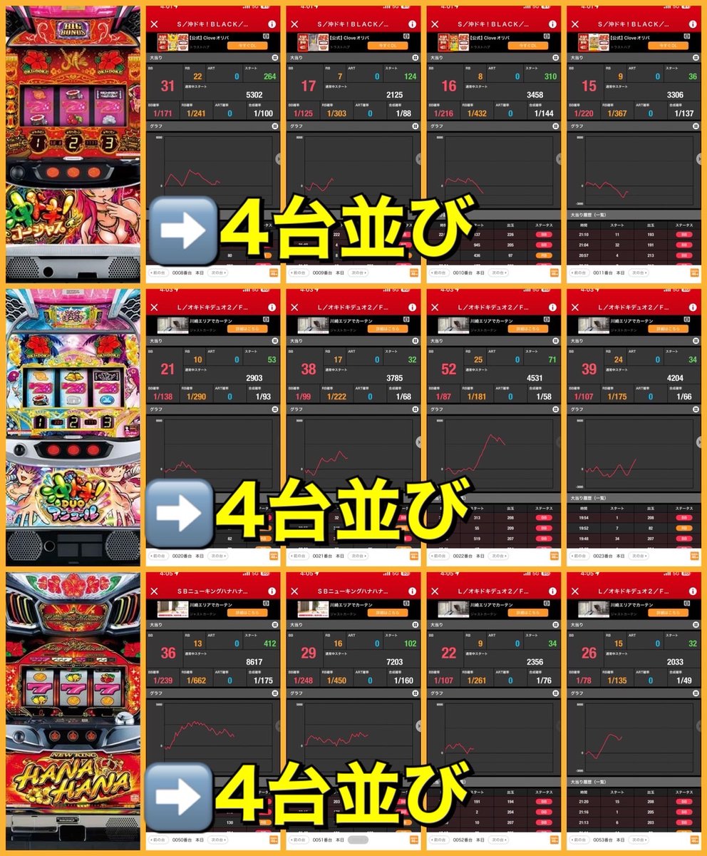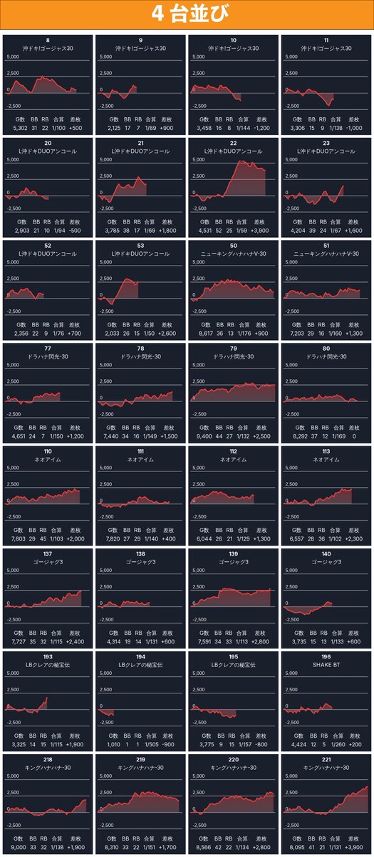 SBの末尾④⓪絡みの4台並びは9箇所。単品でも多数仕掛けがあるので素直に末尾④⓪を意識してメイン機に行けば良い環境。