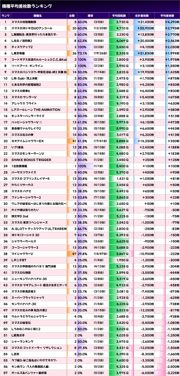 ✨平均差枚数上位機種✨
