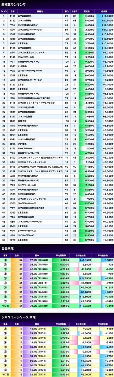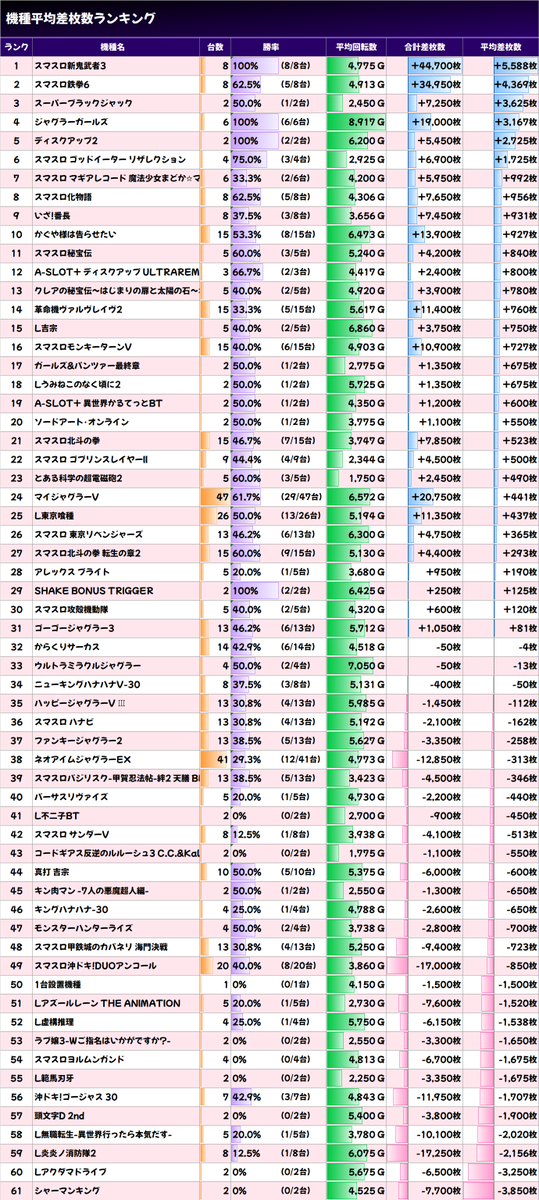 ✨平均差枚数上位機種✨