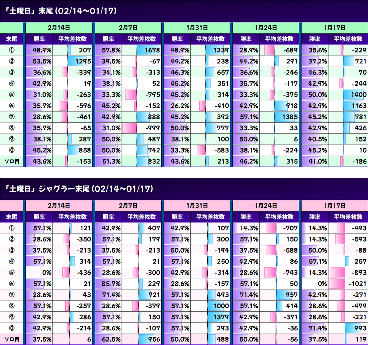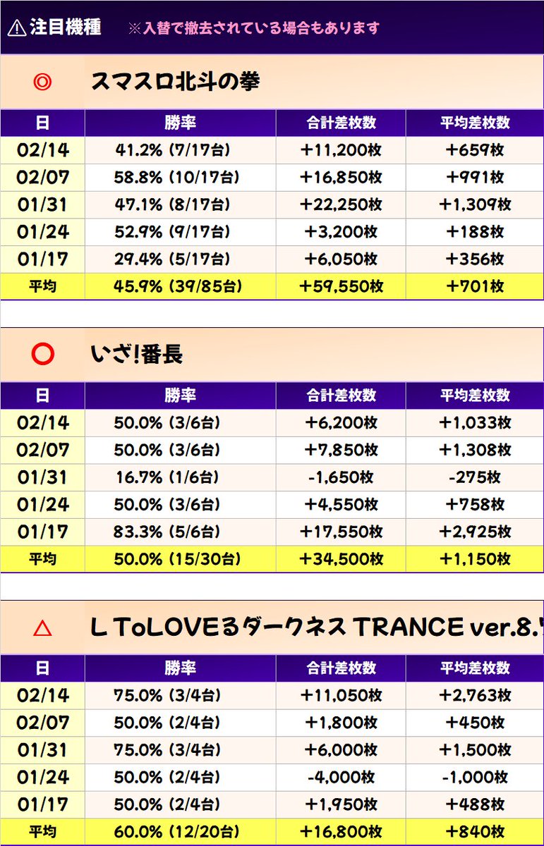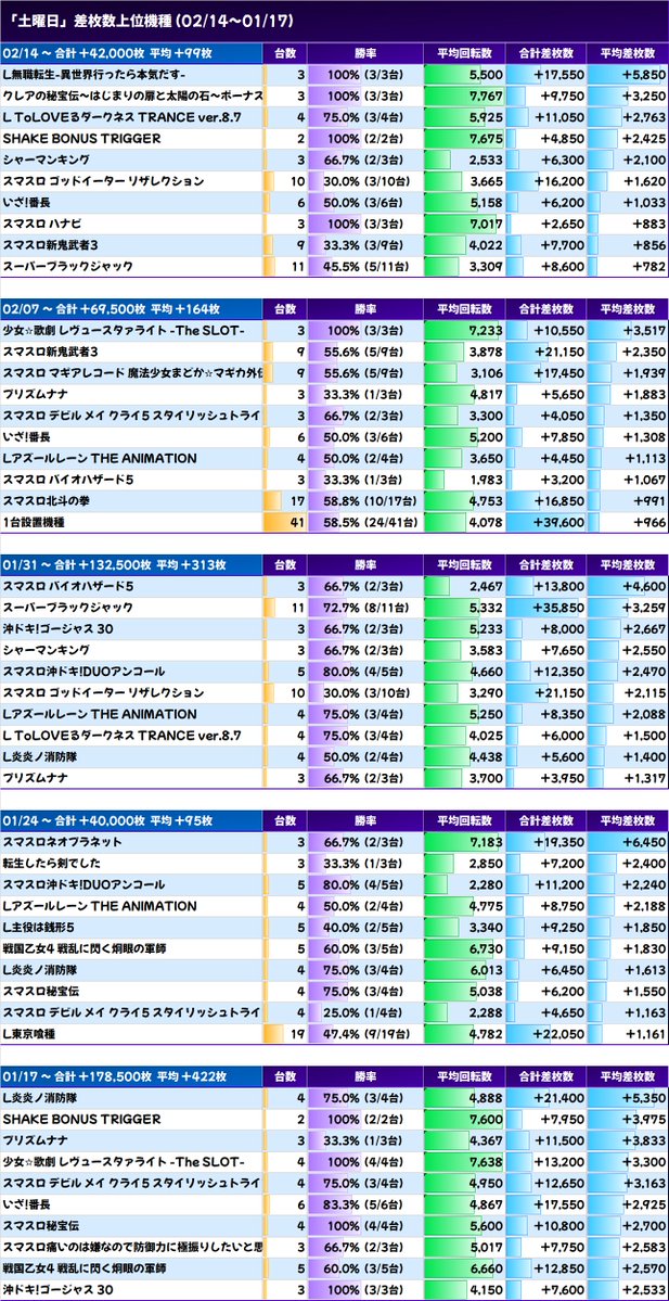 02/14 合計 +42,000枚 平均 +99枚(168/423台)