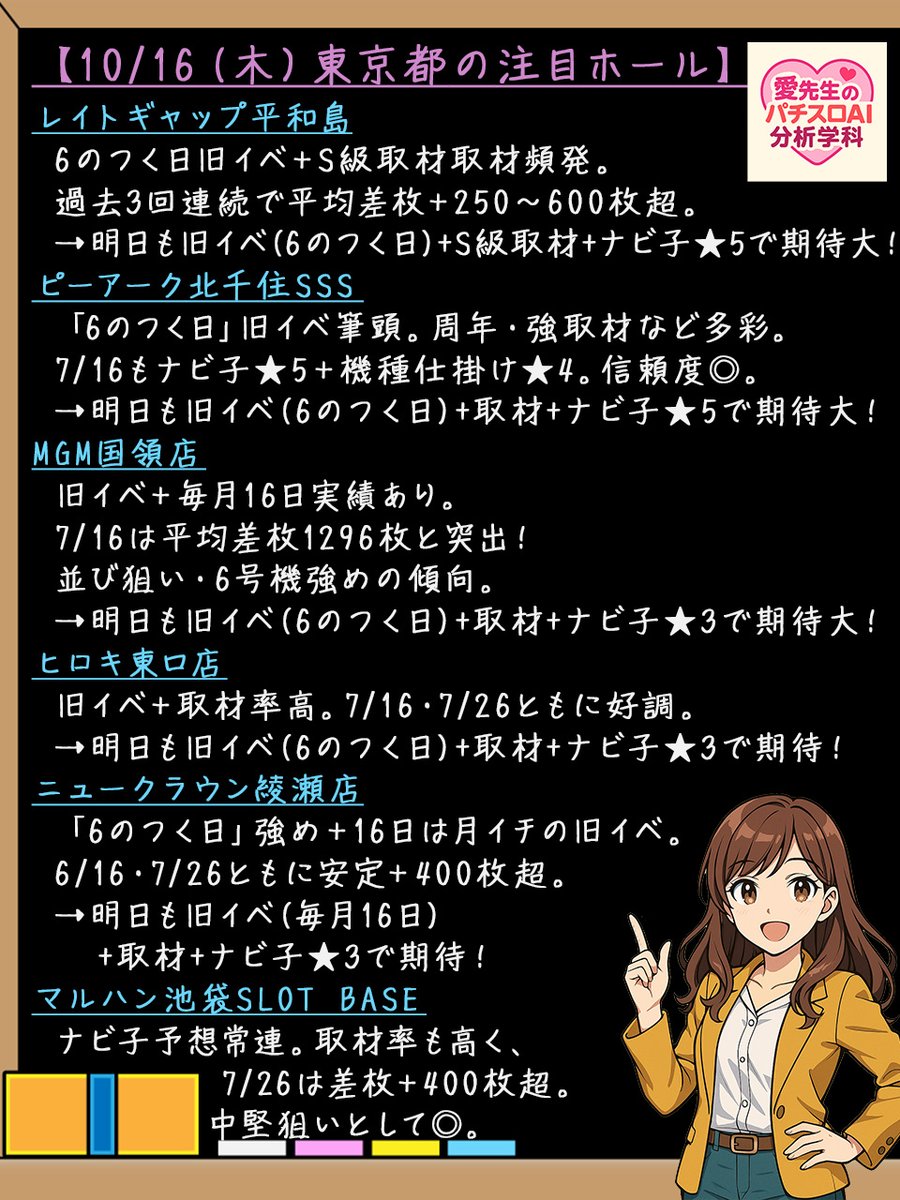 投稿本文: 【2025/10/16 都内スロットオススメの台(店/台番号/機種)】