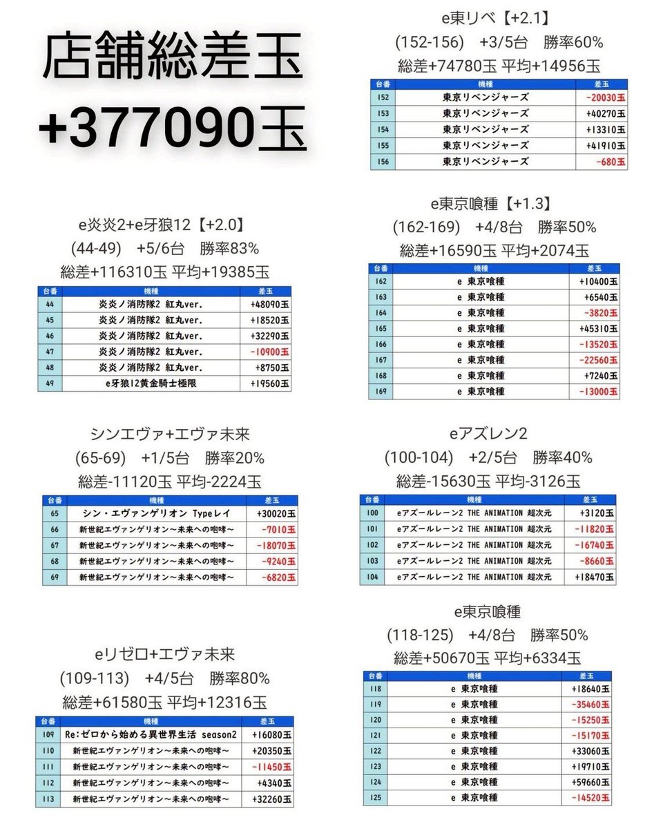 店舗総差玉+377090玉 平均+2231玉