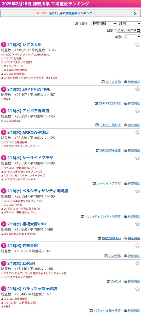 2/18 出玉ランキング(東京🗼/神奈川🏙️)