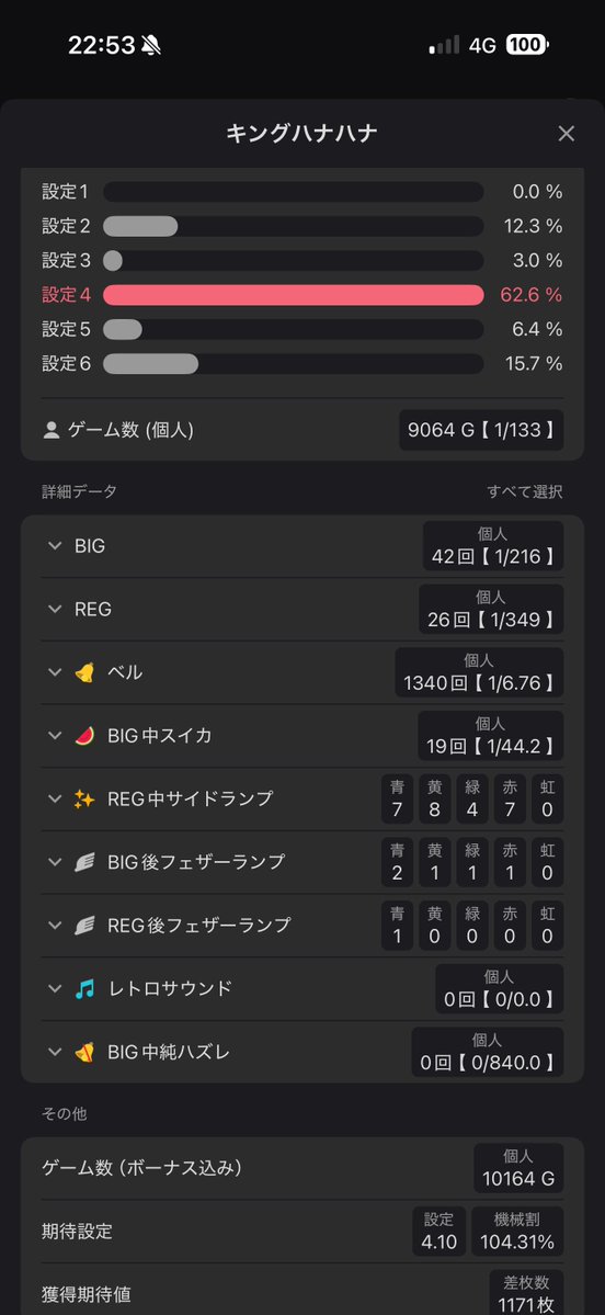 後半はボーナス引くけどスイカ🍉依然落ちず、4の上振れ的な…。